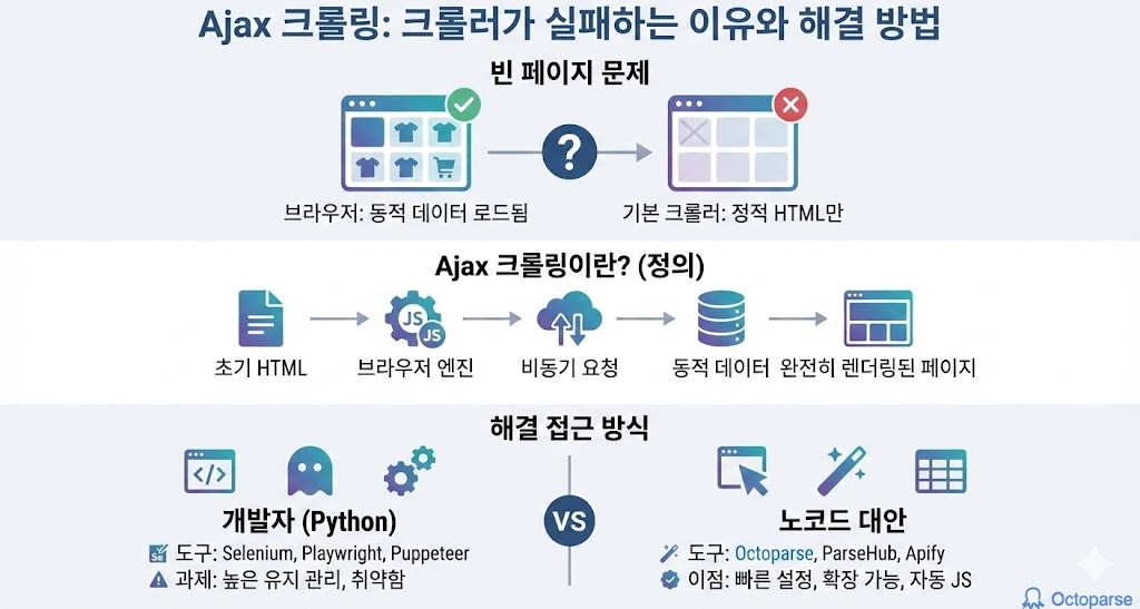 기존 크롤링 방식과 비교했을 때, Ajax 크롤링에는 몇 가지 핵심적인 차이점이 있습니다.