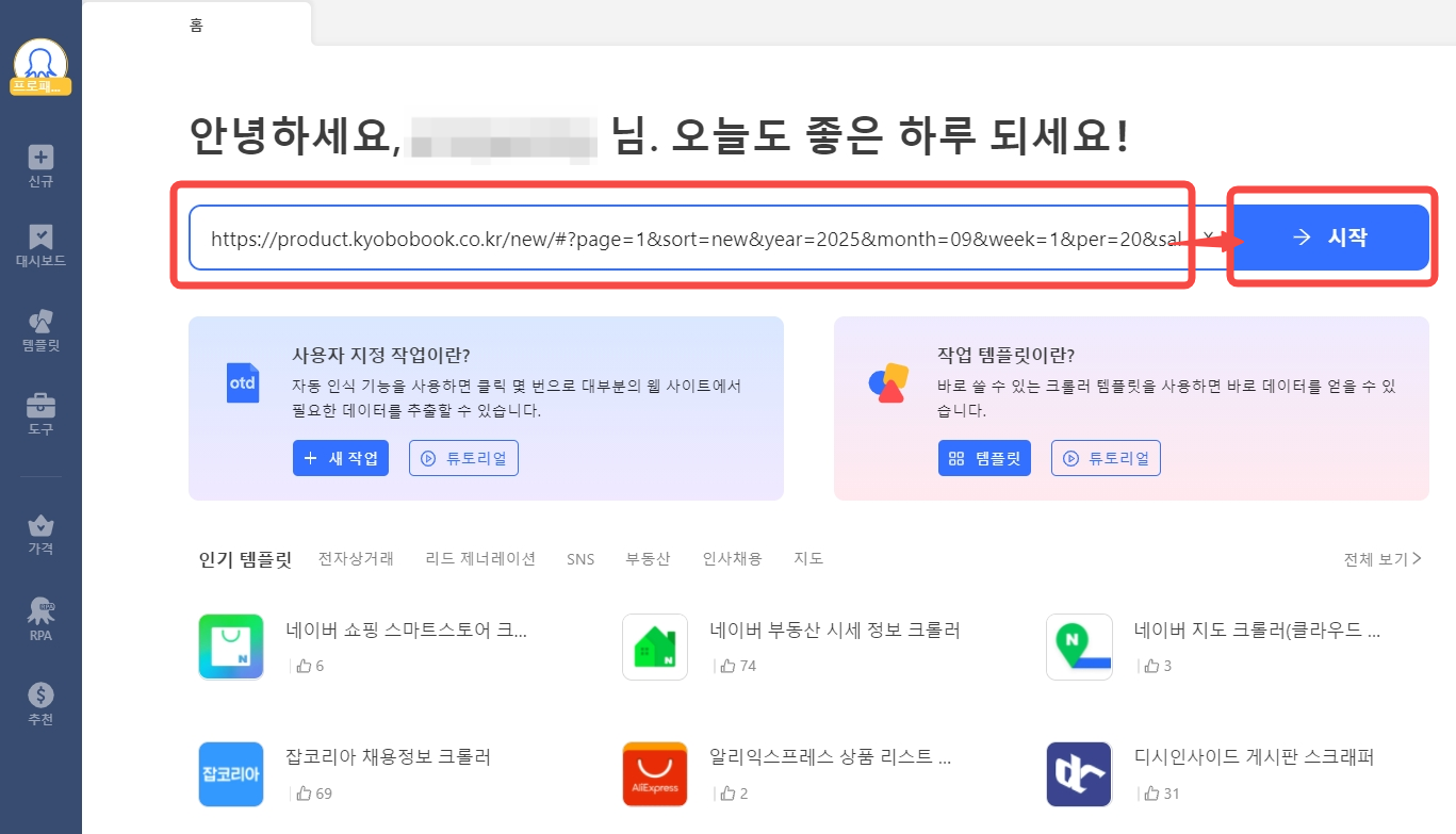Octoparse 로그인 후 홈 화면 입력창에 추출할 상품 데이터가 있는 웹 페이지 URL을 입력하고 시작 버튼을 클릭합니다.