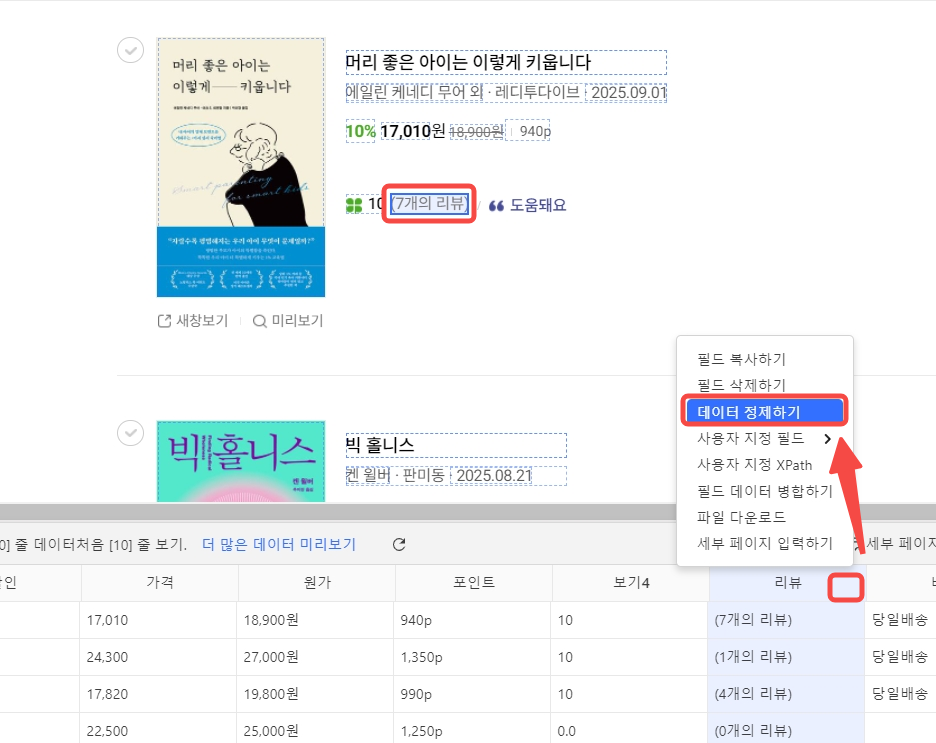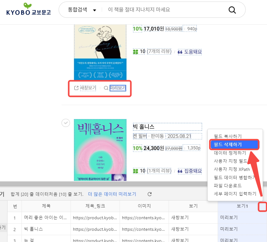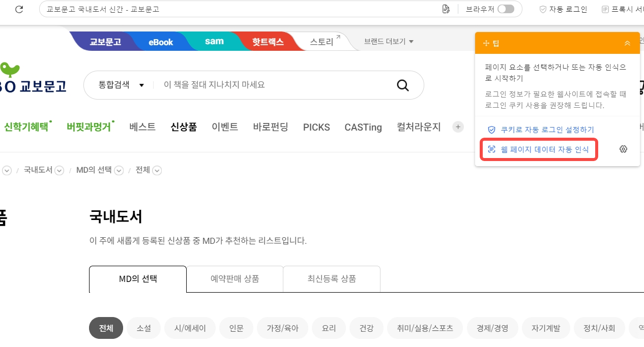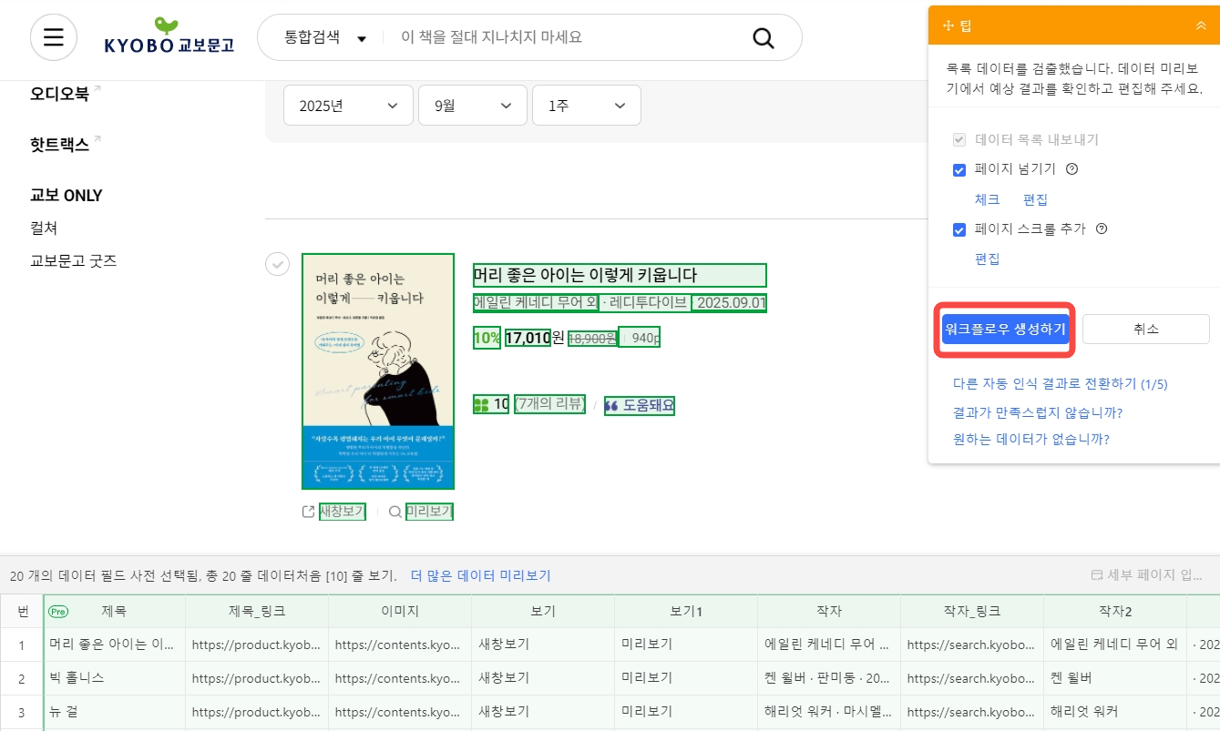 데이터 필드 자동 인식이 끝나면 교보문고 웹 페이지에서 추출 예상 데이터가 다음처럼 연두색으로 하이라이트 표시됩니다.