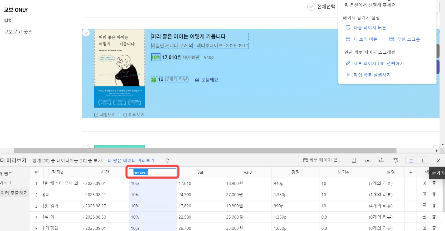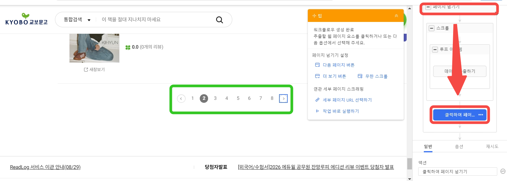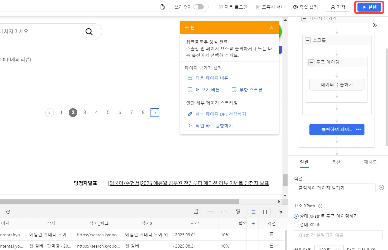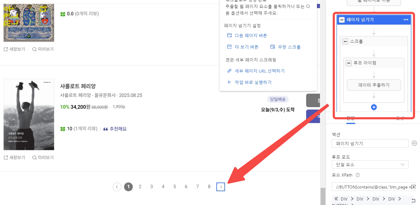 여러 페이지로 구성된 도서 정보를 추출해야 하기에 페이지 넘기기가 정상적으로 작동하는지 체크해 보아야 합니다. 페이지 넘기기 클릭 후 클릭하여 페이지 넘기기를 클릭하면 왼쪽 내장 브라우저에서 페이지가 제대로 넘겨지고 있는지 확인할 수 있습니다.