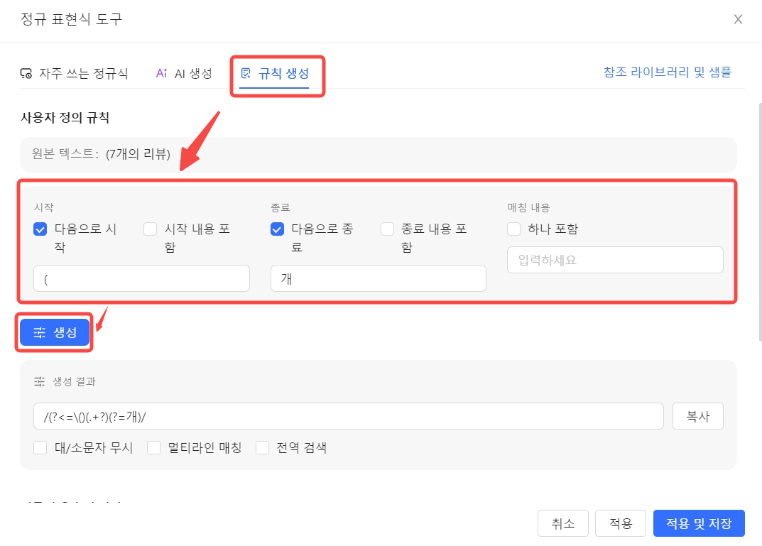 정규 표현식 도구에서 규칙 생성을 선택 후 다음과 같이 설정 후 생성 버튼을 클릭하고 스크롤하면