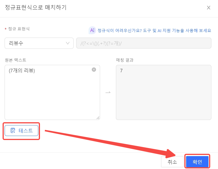 정규표현식으로 매치하기로 돌아와서 테스트 버튼을 클릭하면 설정한 정규식이 잘 적용된 것을 확인할 수 있습니다.
