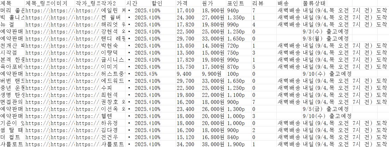 온라인 서점의 방대한 도서 데이터를 활용하여 시장 분석, 개인 도서 추천 시스템 구축, 또는 단순한 데이터베이스를 만들고 싶은 분들이 많으실 텐데요. 수많은 책들의 제목, 저자, 가격, 평점 등의 정보를 일일이 수집하는 것은 결코 쉬운 일이 아닙니다.