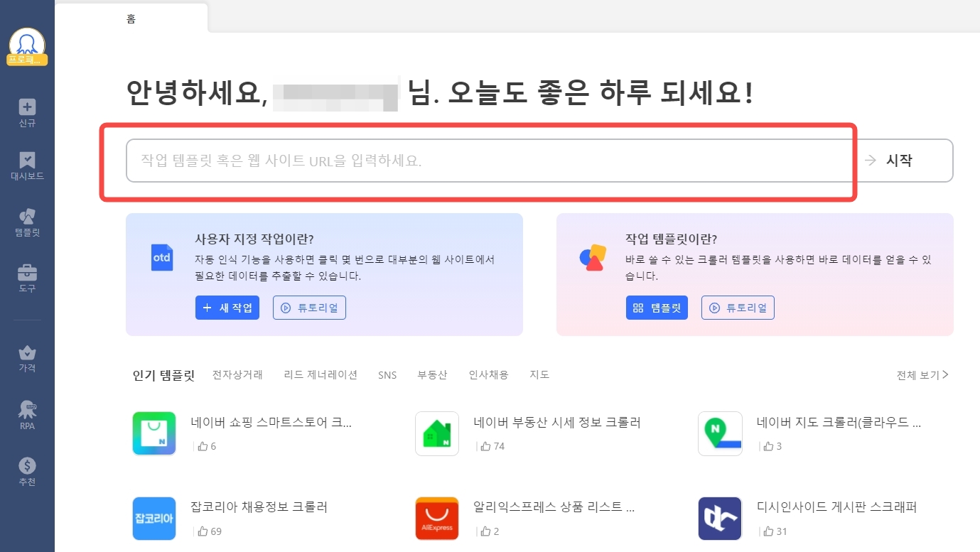 수백 개의 국내외 인기 웹 사이트 스크래핑 템플릿으로 간단하게 데이터를 추출할 수 있습니다.