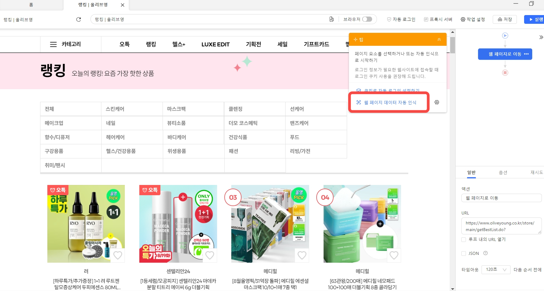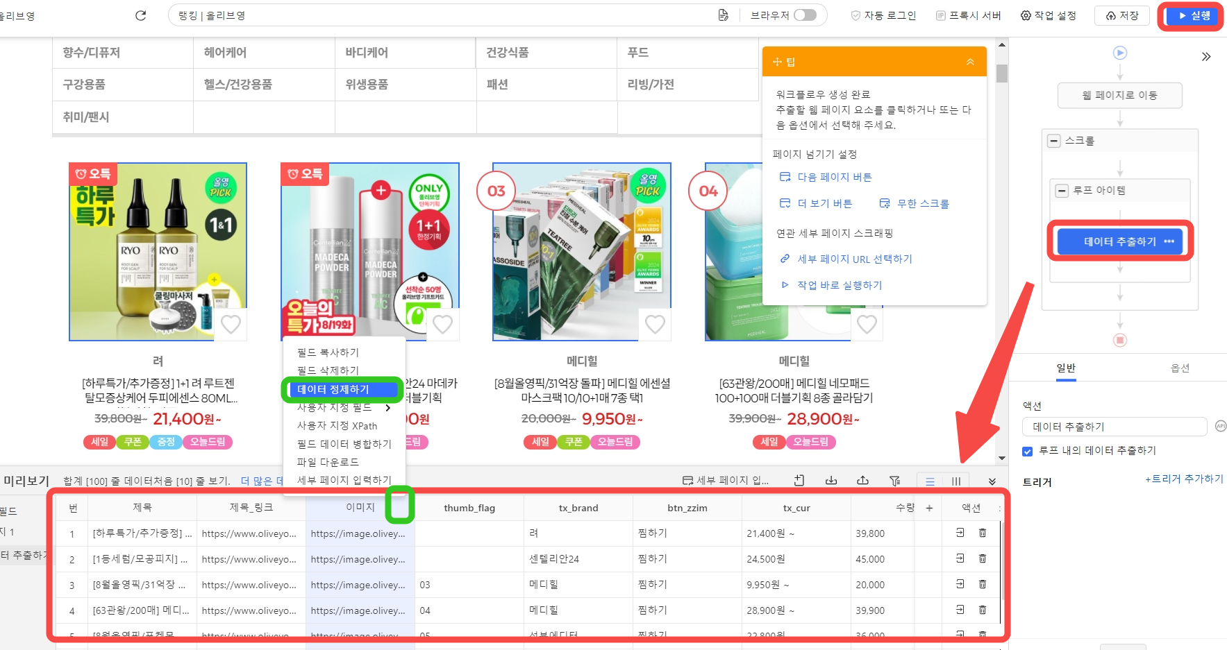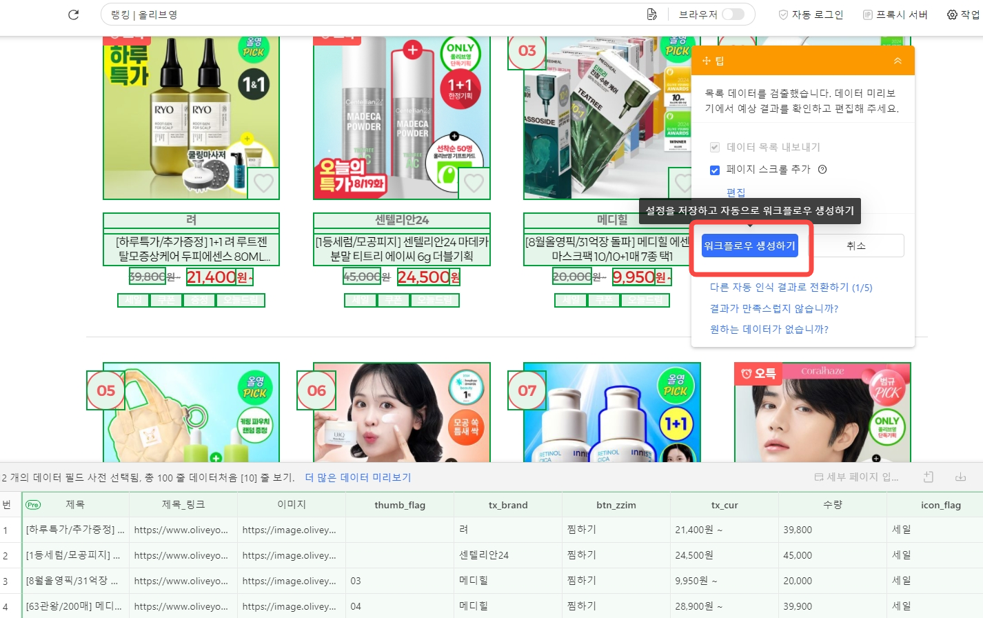 데이터 필드 자동 인식이 끝나면 올리브영 랭킹 페이지에서 추출 예상 데이터가 다음처람 연두색으로 하이라이트 표시됩니다.