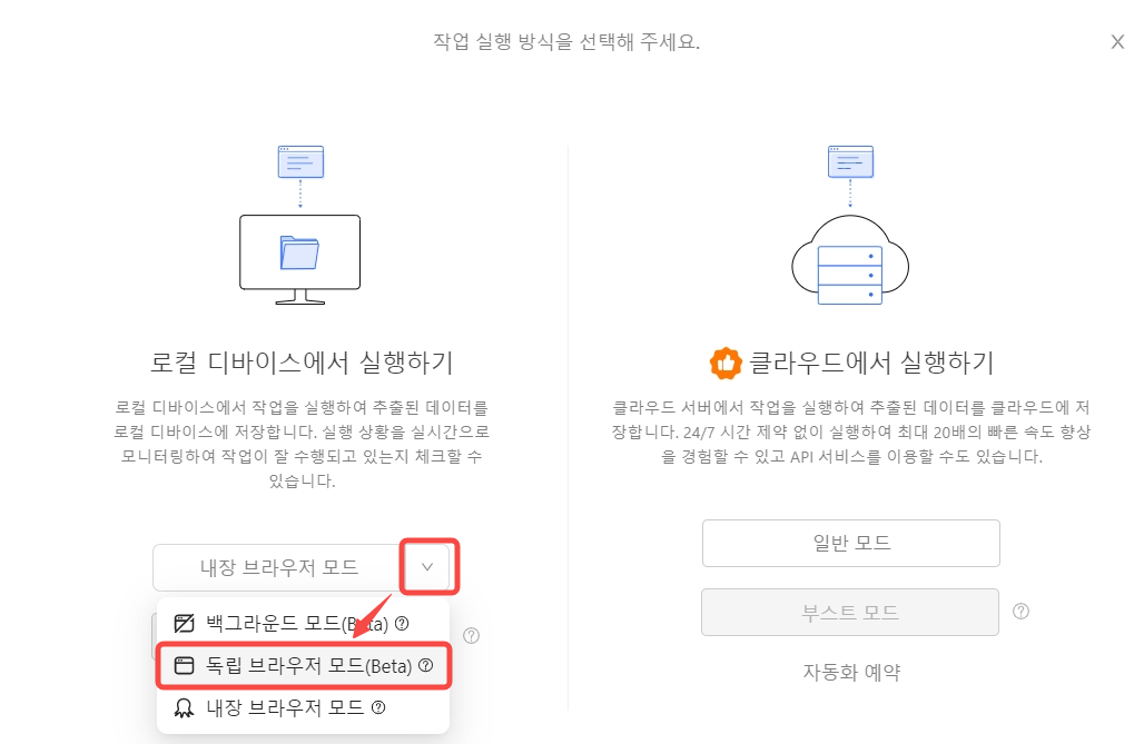 최근 업데이트된 8.8 버전의 경우 로컬 모드에 백그라운드 모드와 독립 브라우저 모드가 추가되었습니다. 이 두 모드는 웹 스크래핑을 좀 더 안정적으로 만들기 위해 개발된 모드로 모두 특정 크롬 브라우저를 사용합니다.