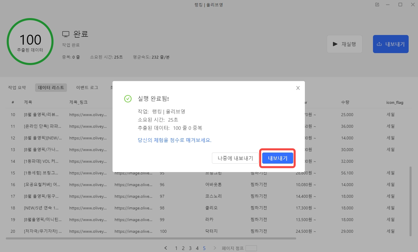 작업 실행이 완료되면 내보내기 버튼을 클릭하여 원하는 형식으로 데이터를 내보낼 수 있습니다.