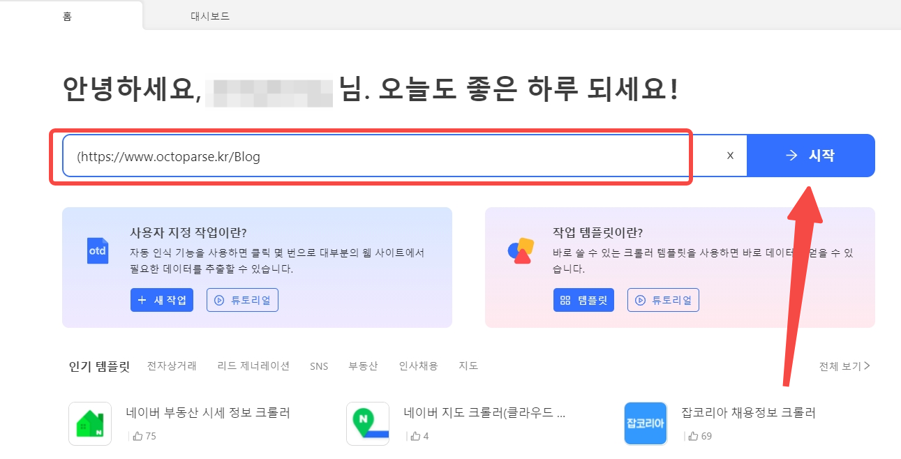 1단계 : Octoparse를 시작하고 데이터를 추출하려는 웹 페이지의 URL을 입력합니다. 입력한 후 시작을 클릭합니다. 여기에서는 Octoparse 블로그(https://www.octoparse.kr/blog)를 입력합니다.