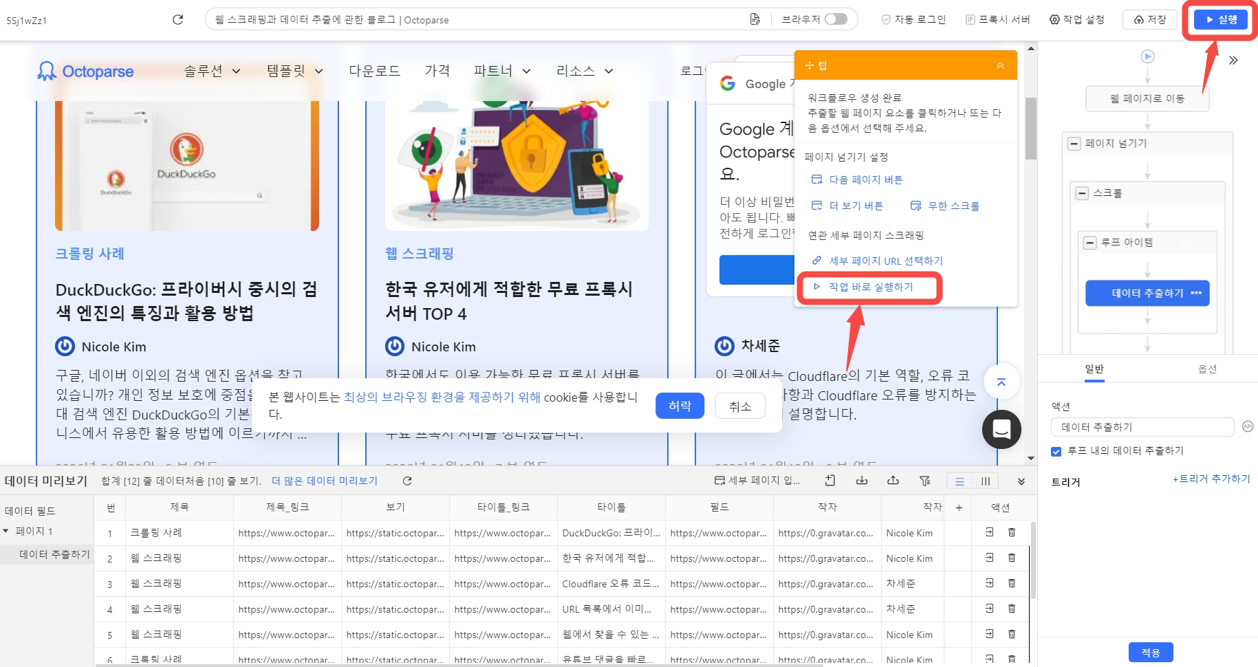 Step 4 : 추출할 데이터와 워크플로우가 문제가 없으면, 팁의 작업 바로 실행하기 혹은 화면 우측 상단의 실행 버튼을 클릭합니다.